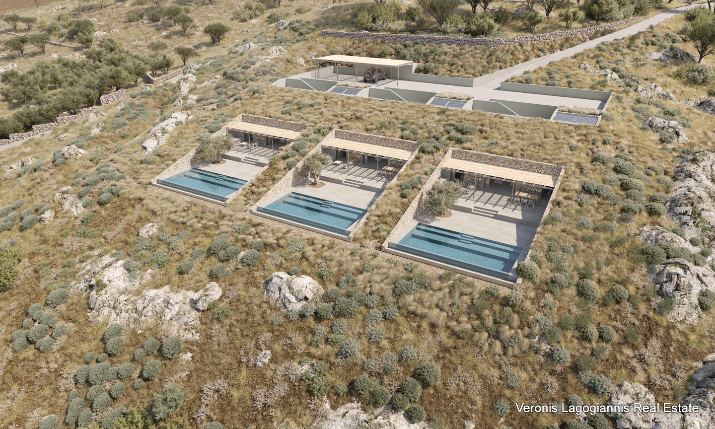 Στον Λόφο της Χώρα της Νάξου, πωλούνται τρεις ημιτελής υποσκαφές κατοικίες με συνολικό εμβαδόν 160 m2 εκάστη και περίπου 1.500 m2 κήπο.