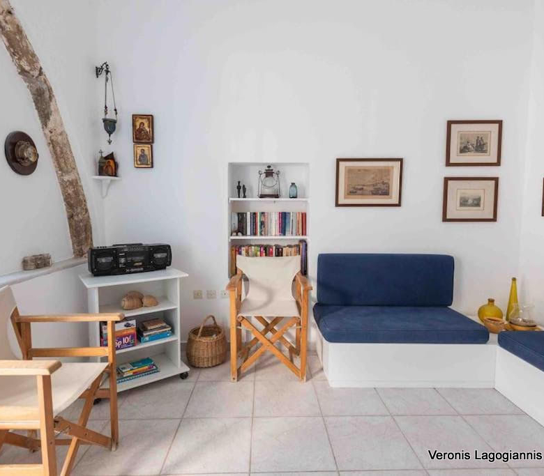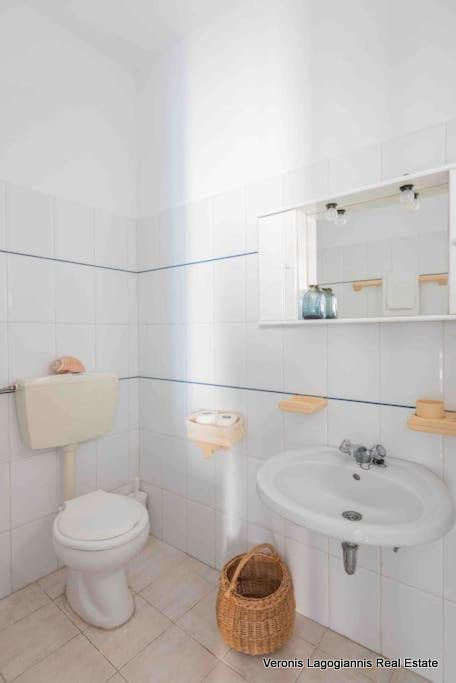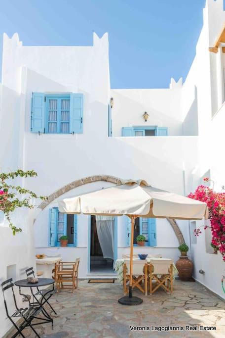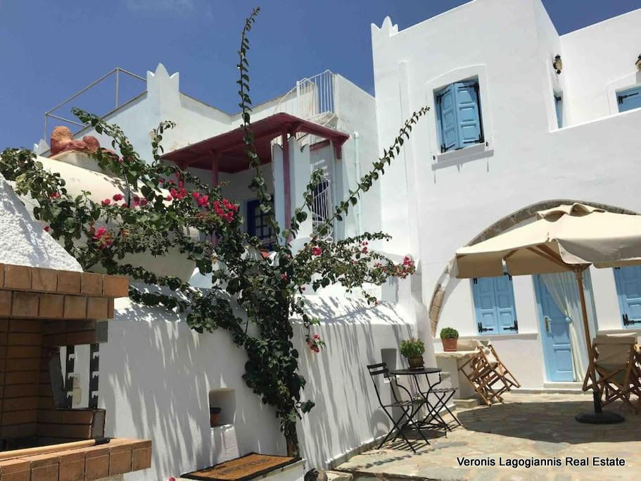 Στο ισόγειο υπάρχει μια ιδιωτική αυλή με χτιστό γωνιακό καναπέ, με ένα παλιό μαρμάρινο τραπέζι , υπαίθριο ντους, μπάρμπεκιου, ομπρέλα και ένα επιπλέον τραπέζι για 6 άτομα.
