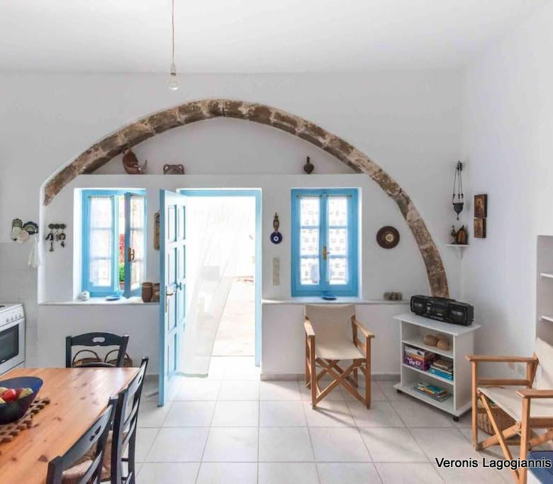 Στο εσωτερικό η κατοικία αποτελείται από έναν ενιαίο χώρο με κουζίνα και καθιστικό, 3 υπνοδωμάτια και 2 μπάνια.