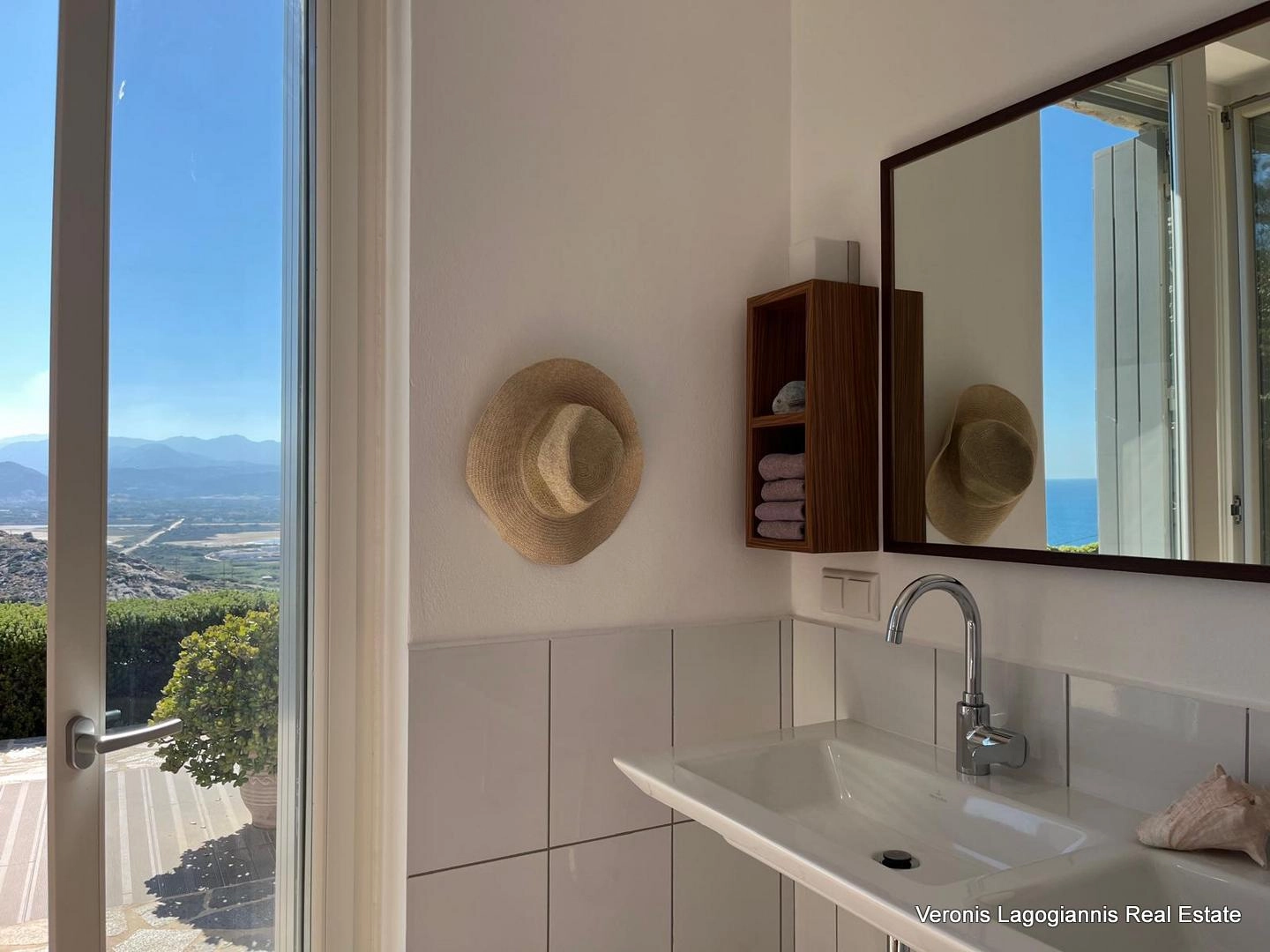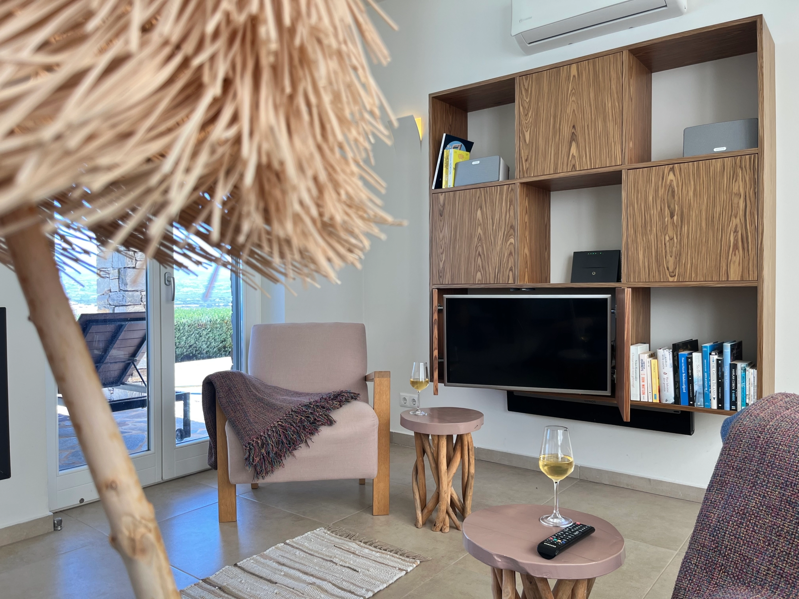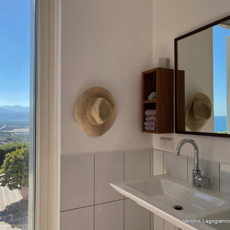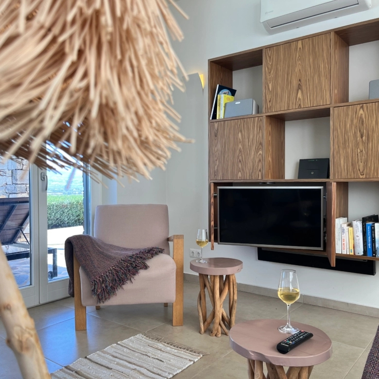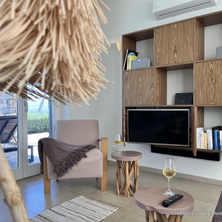 Ο εσωτερικός σχεδιασμός συνδυάζει φυσικά υλικά και αρχιτεκτονικό φως, δημιουργώντας μια ατμόσφαιρα άνεσης και κομψότητας. Ο περιβάλλον χώρος είναι διαμορφωμένος με λεβάντες και δεντρολίβανο, ενσωματωμένος αρμονικά στο τοπίο.
