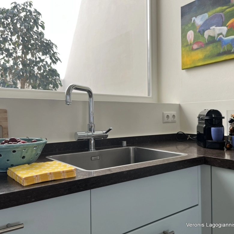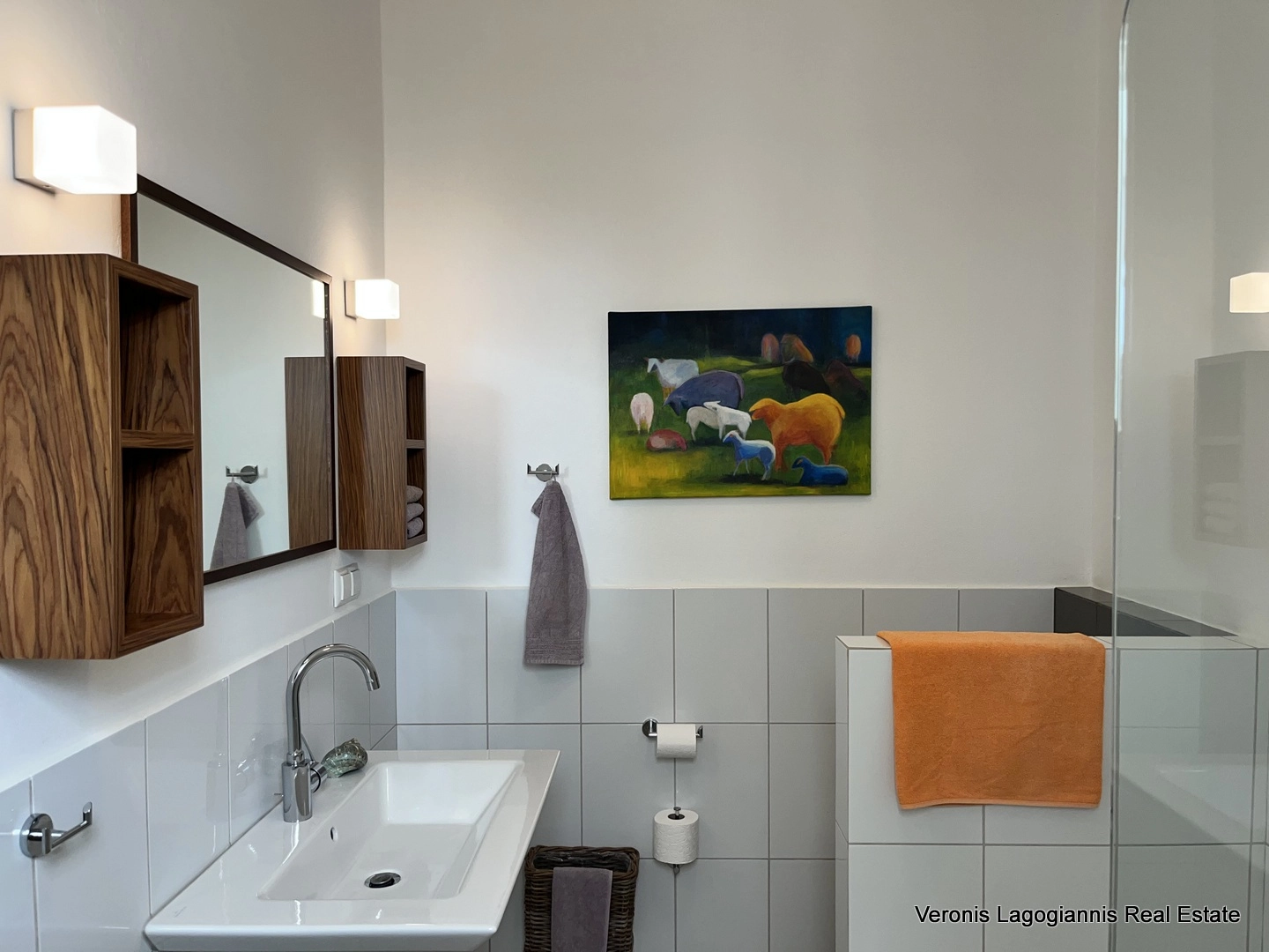 Επιπλέον υπάρχει αποθηκευτικός χώρος με πλυντήριο και πρόβλεψη για στεγνωτήριο, καθώς και κλειστό γκαράζ με αποθήκη δίπλα στην κατοικία.