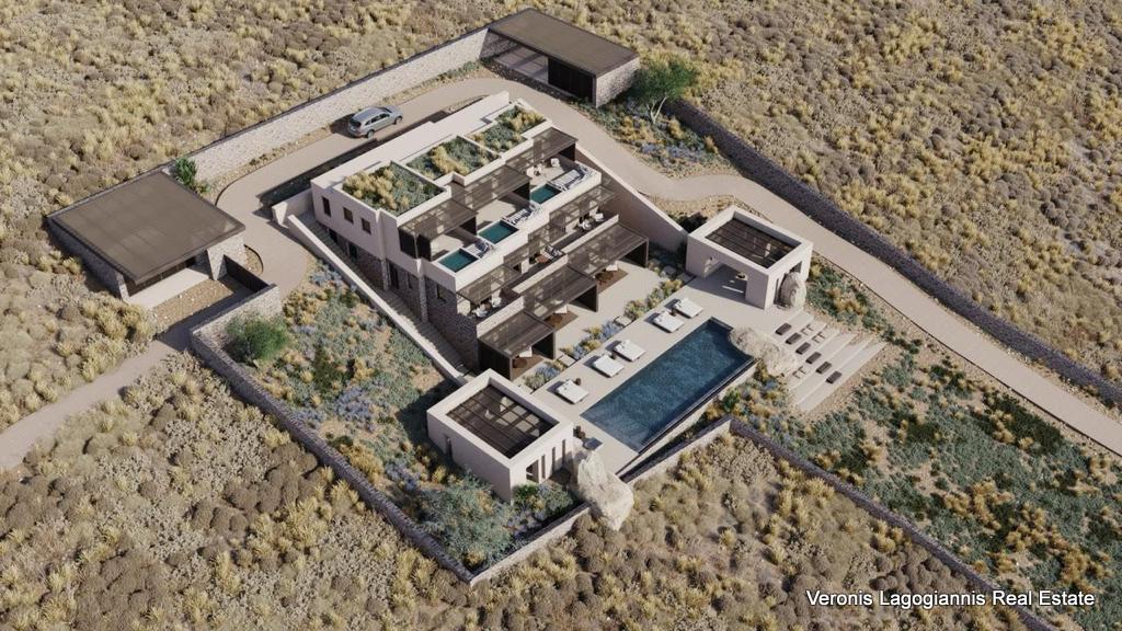 Το κτίριο είναι χτισμένο σύμφωνα με την κυκλαδίτικη αρχιτεκτονική με άριστη ποιότητα υλικών και ιδιαίτερες κατασκευαστικές λεπτομέρειες. Η θέα προς το απέραντο γαλάζιο του Αιγαίου είναι μοναδική και ανεμπόδιστη απ’ όλα τα σημεία.