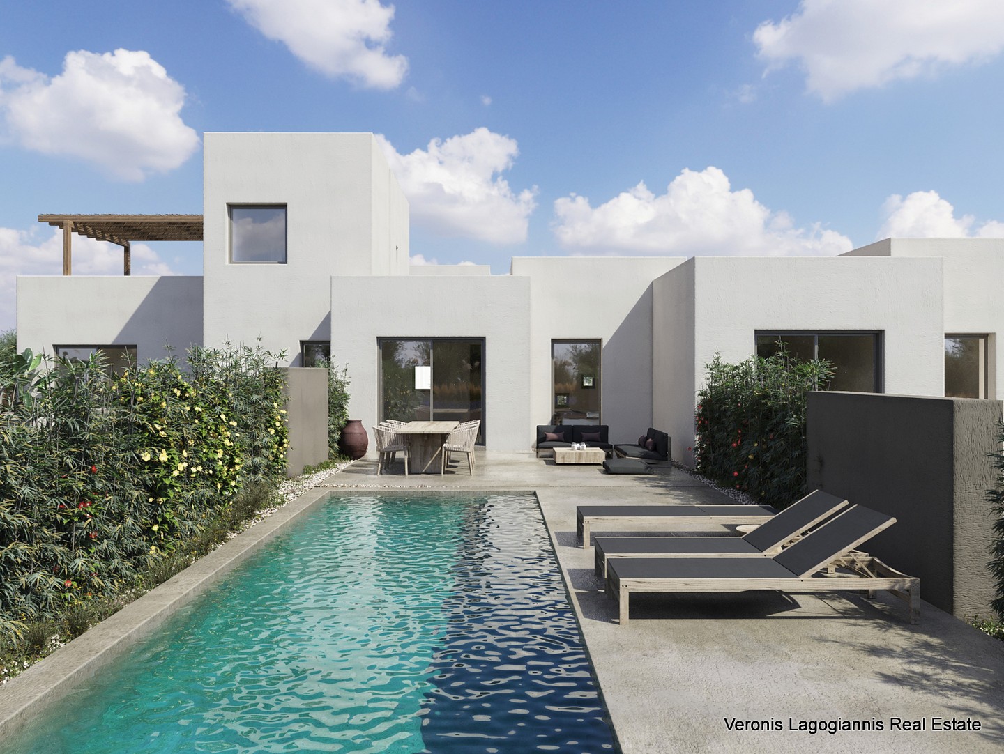 Each residence features its own private outdoor area with a swimming pool, offering an ideal setting for relaxation and seclusion.
