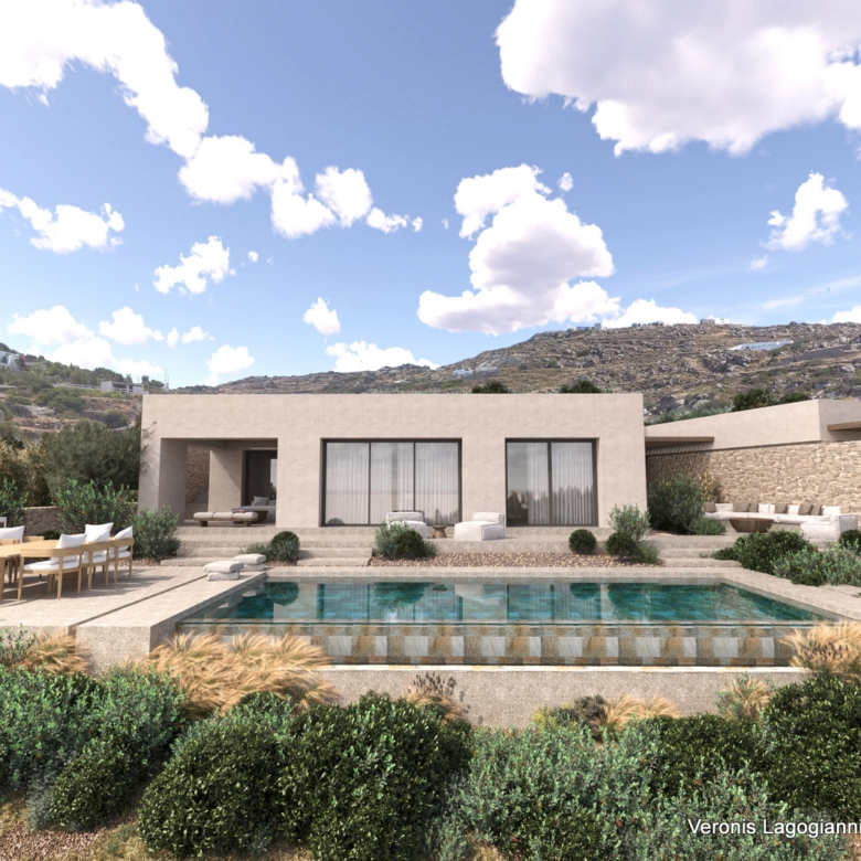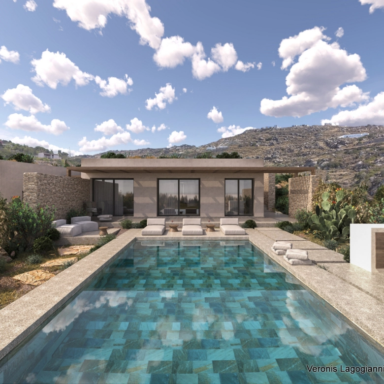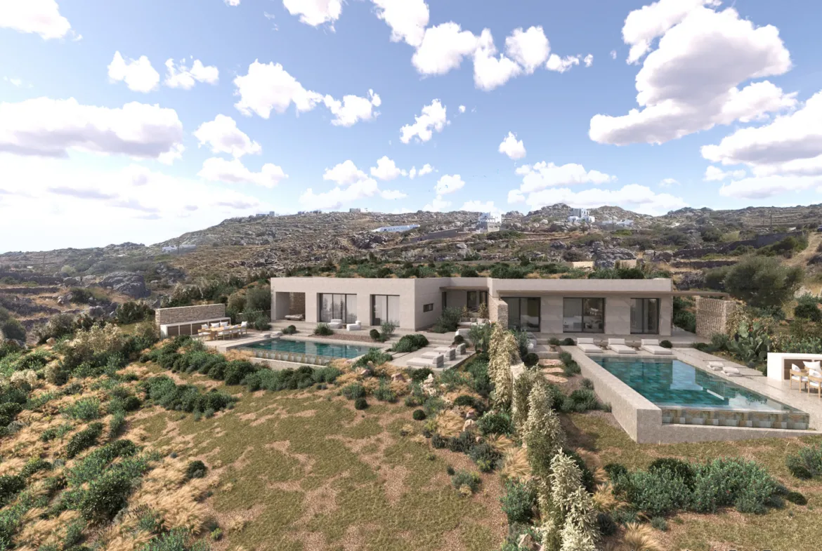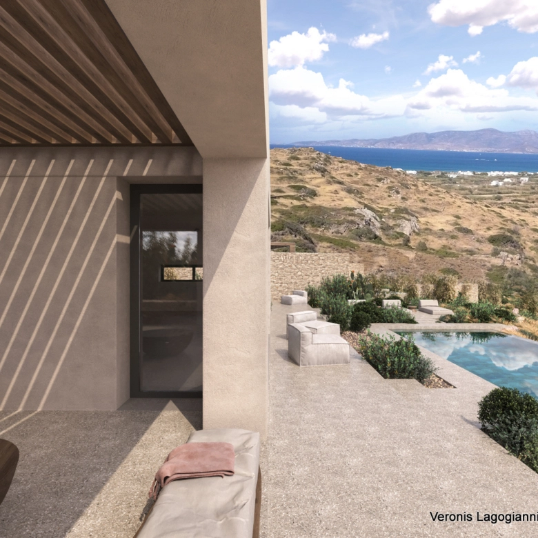 The outdoor spaces include a large terrace with a 42 sq.m. swimming pool and unobstructed views of the Town of Naxos, Stelida, and Agios Prokopios. Additionally, the house comes with a surrounding area of 2 hectares.