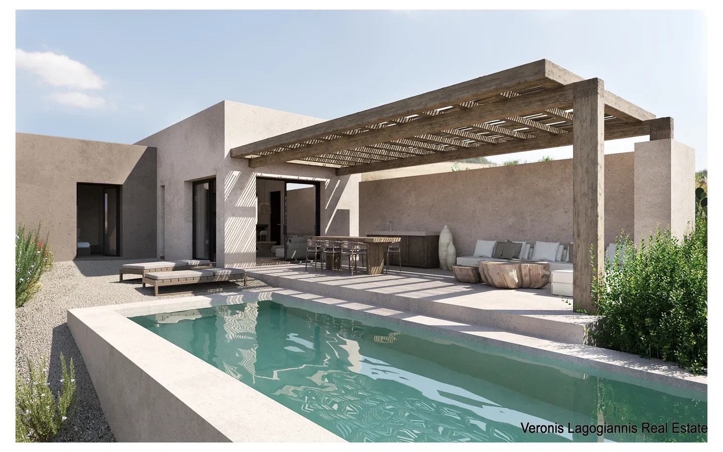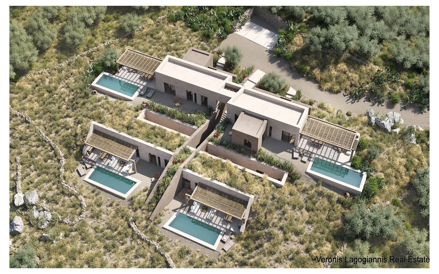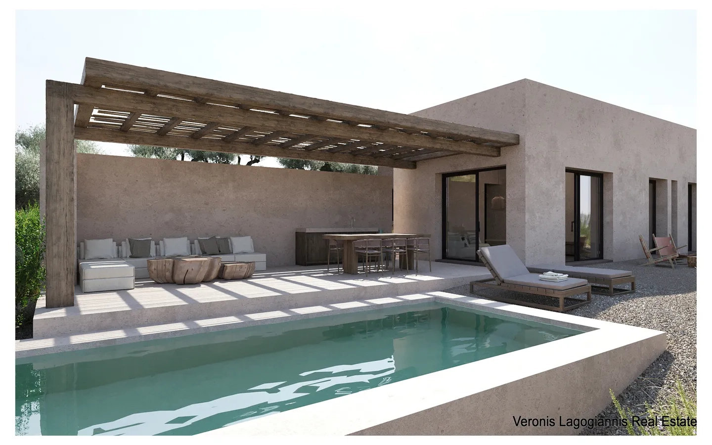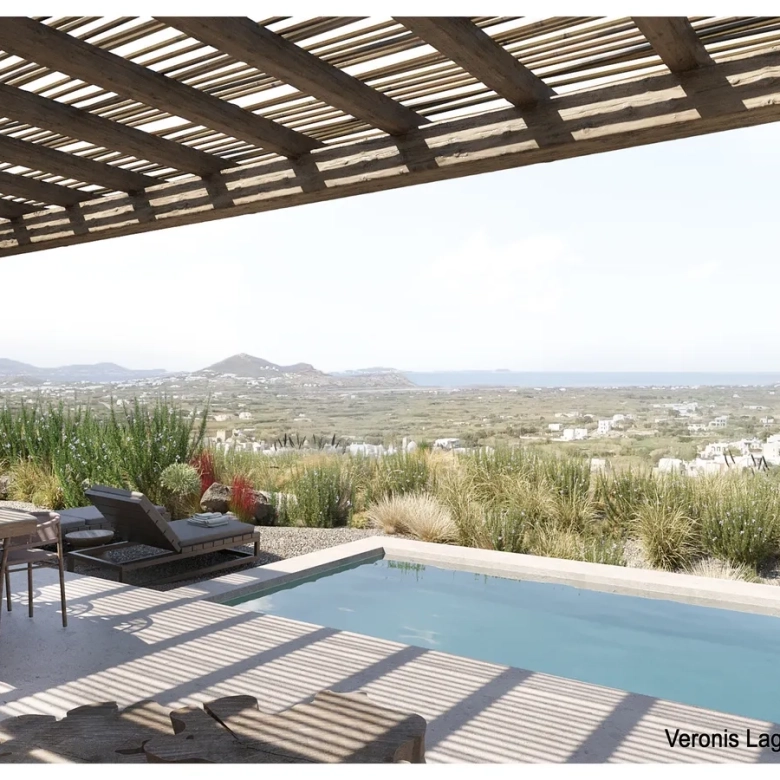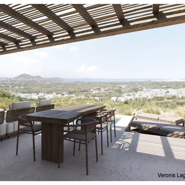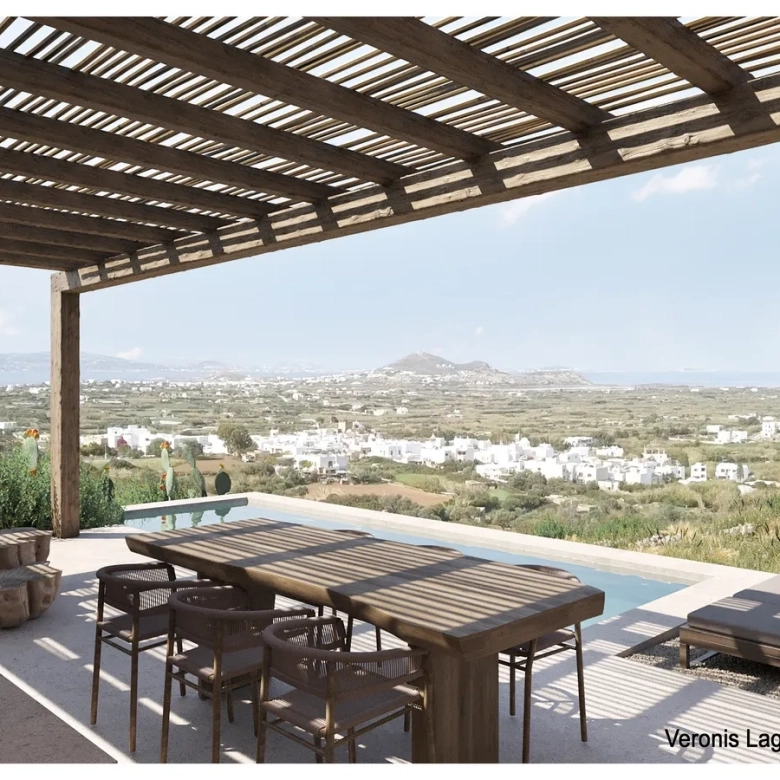Each residence has a private pool, large pergolas and 2 parking spaces. The distance from Naxos Town is only 8 km, while the neighboring village of Vivlos with its windmills is 3 km away. The famous beaches of Agios Prokopios and Agia Anna are 5 minutes away by car. At a distance of 7 km is the island’s airport. Code: 640507