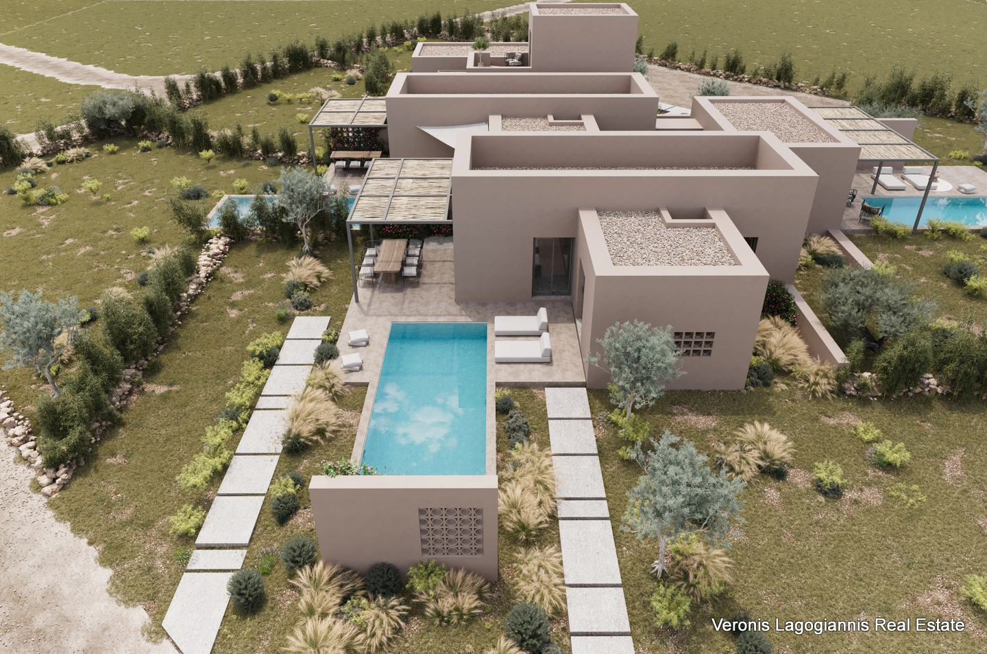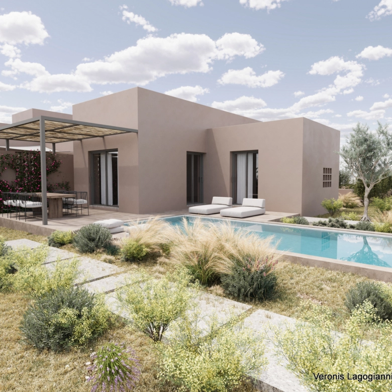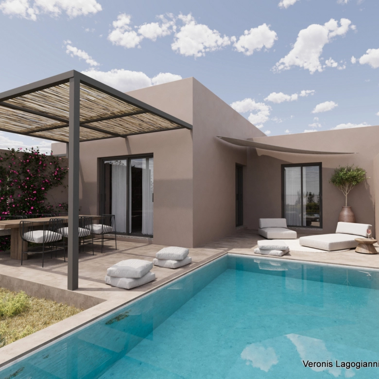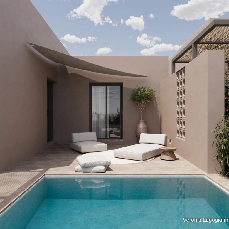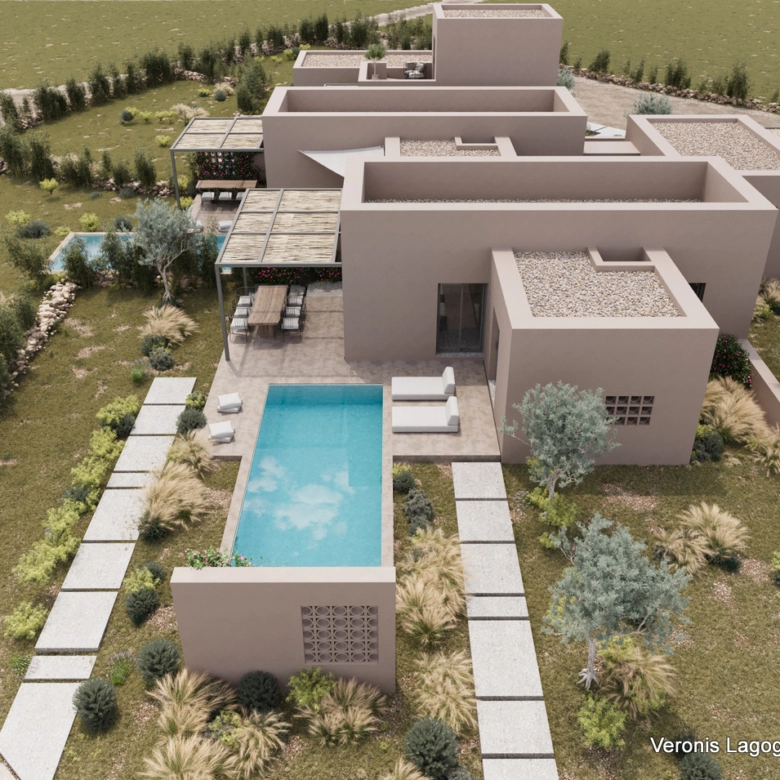 The exclusive use land is 412 m2. In this area there is a swimming pool of 24 m2 and a garden. A parking space corresponds to house 3.