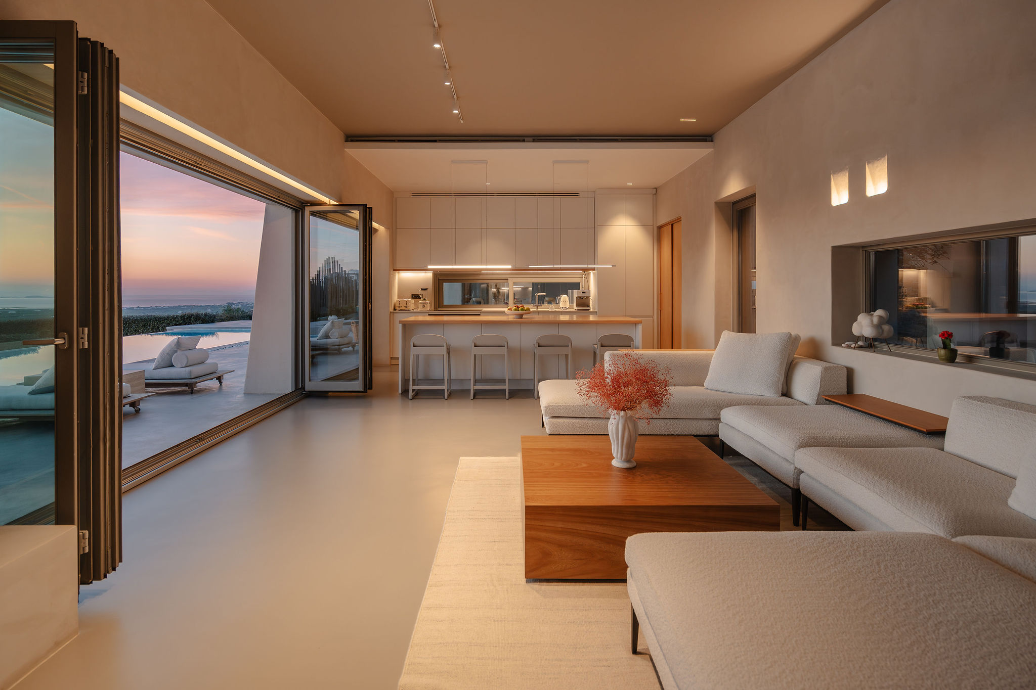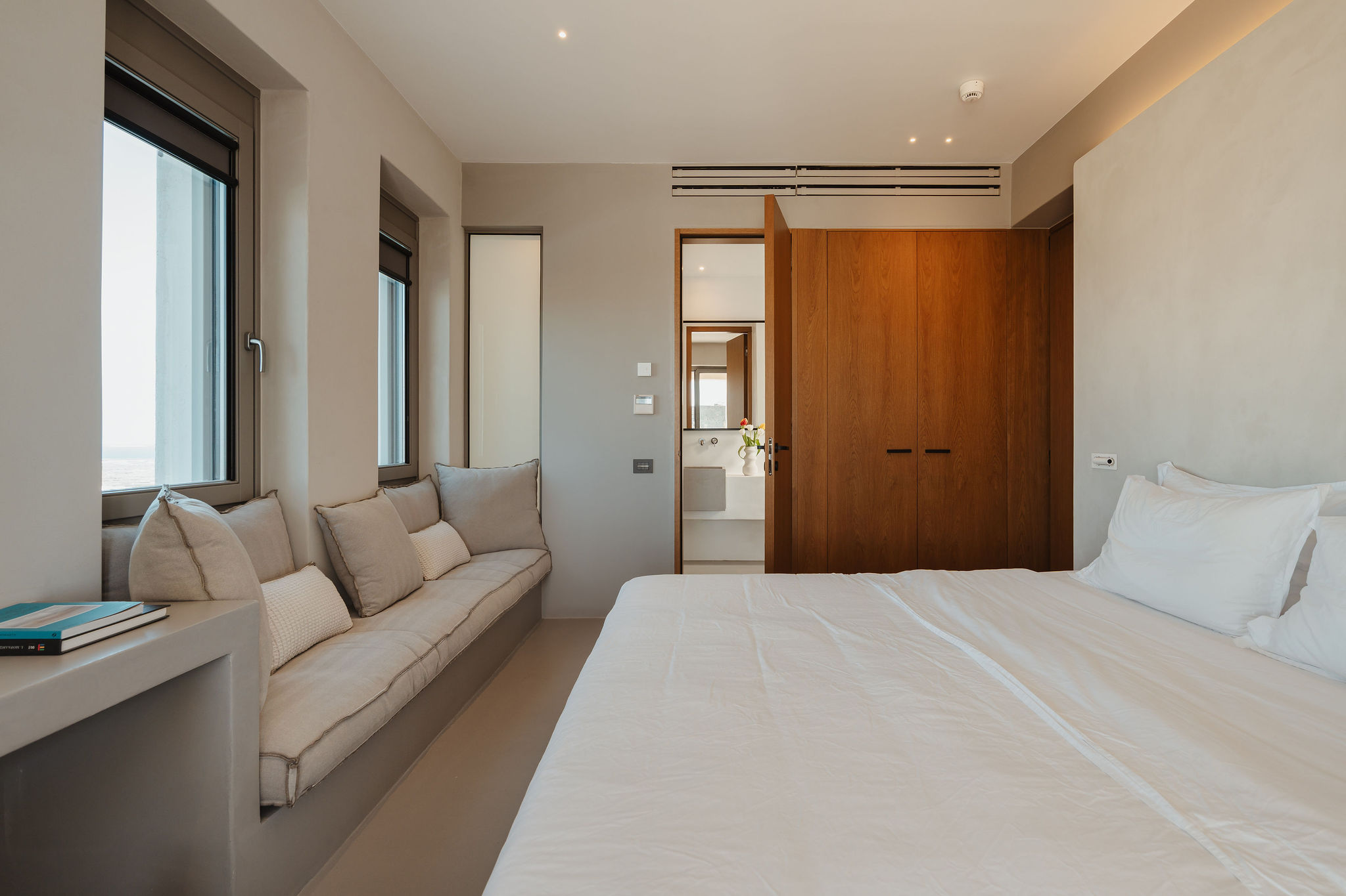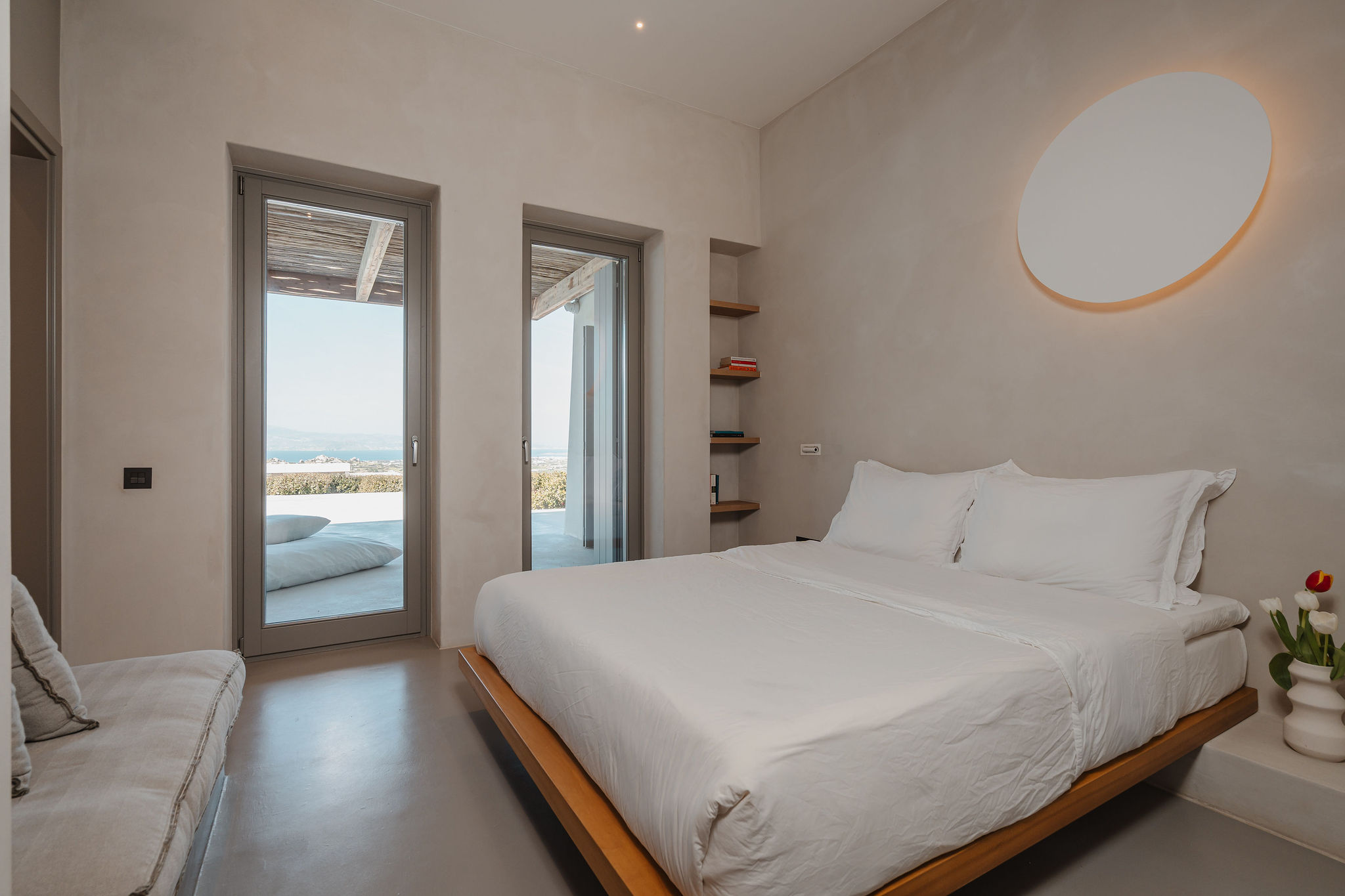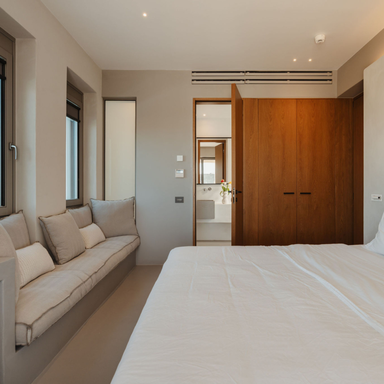 The main residence features four en-suite bedrooms, with the master suite occupying the entire upper level, offering unparalleled privacy and breathtaking panoramic sea views. Each bedroom enjoys access to a private terrace, creating a sense of exclusivity and independence from the main outdoor living spaces.