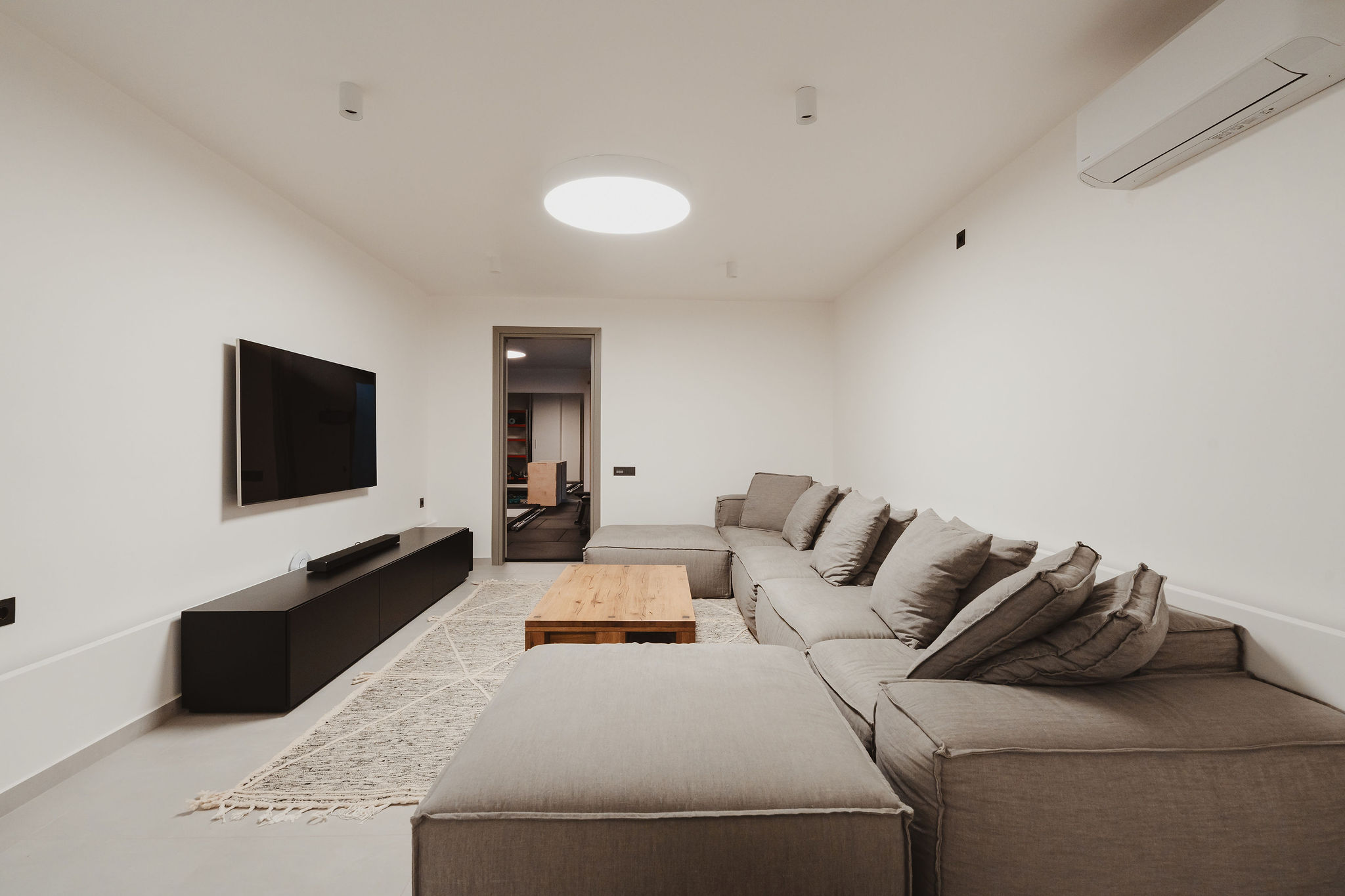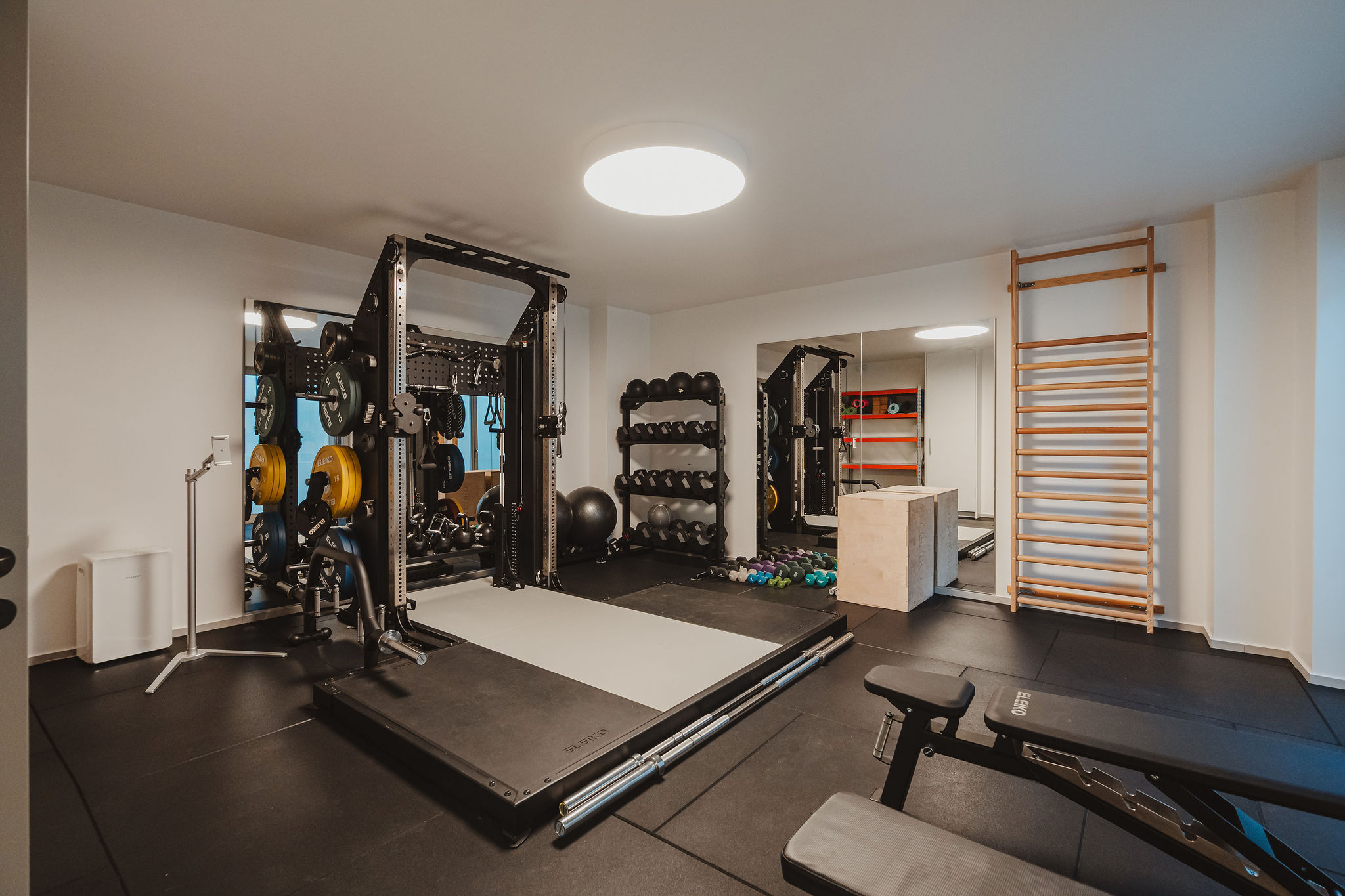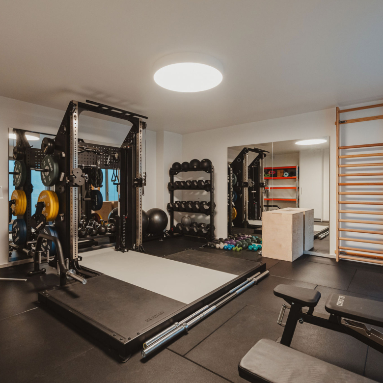 The lower level hosts a fully equipped gym, as well as auxiliary areas including a mechanical room and storage facilities.