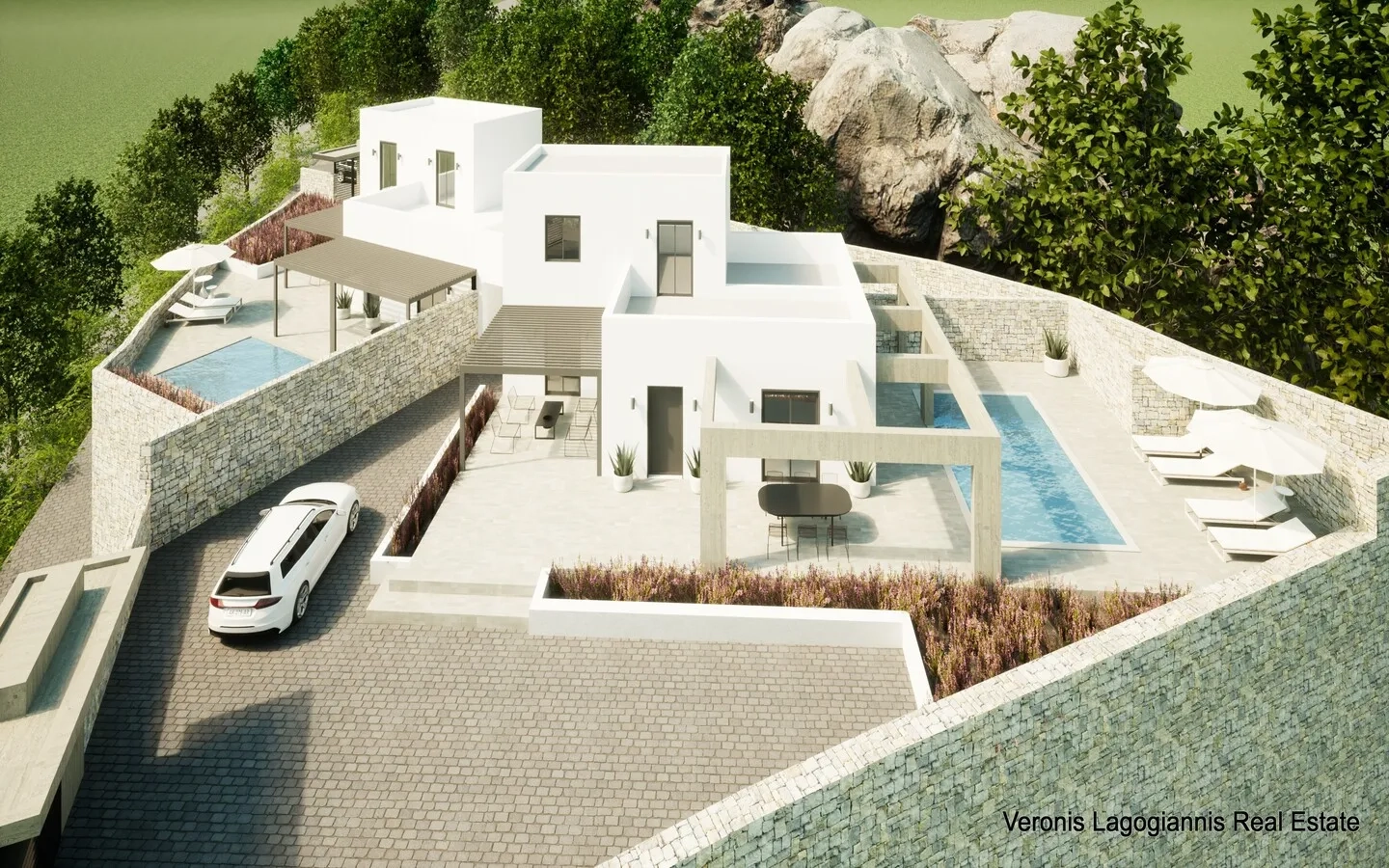 The house is located in a quiet area, 500 m from the traditional settlement of Vivlos and 4 km from the beach. Inside the house consists of 3 bedrooms, 2 bathrooms, a kitchen, a dining room, a living room and a storage space in the basement. The outdoor area is dominated by a swimming pool. Around the pool there is a wonderful garden, a parking area, a rest area and 3 verandas, 2 on the ground floor and 1 on the first floor.