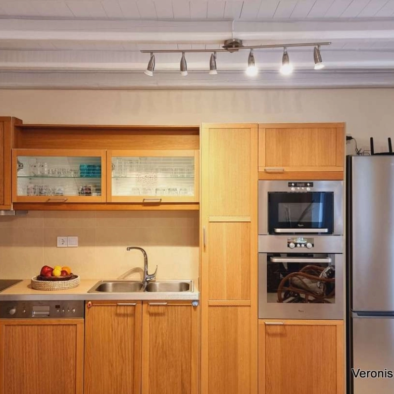 The house is divided into three levels. On the ground level there are a kitchen and a living room with fireplace. Upstairs there are two bedrooms and a bathroom.